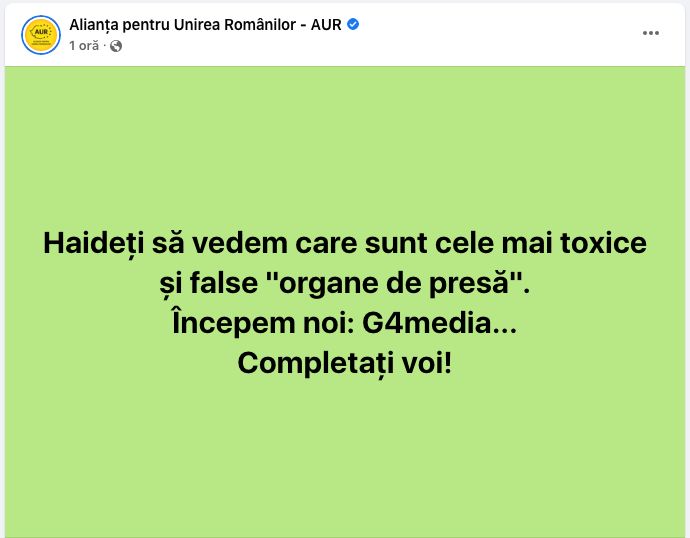 Atac fără precedent al partidului AUR la adresa presei. Partidul propune printr-o postare celor de pe Facebook să facă o listă cu „cele mai toxice şi false organe de presă”. G4media este direct nominalizat.