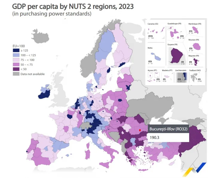 Mai mult, atunci când PIB-ul este ajustat la paritatea puterii de cumpărare (PPS), București-Ilfov atinge 190% din media Uniunii Europene, plasându-se pe poziții similare cu metropole europene de top, precum Bruxelles și Praga. Excepție fac doar statele cu economii distorsionate de companii multinaționale, cum sunt Luxemburg și Irlanda.