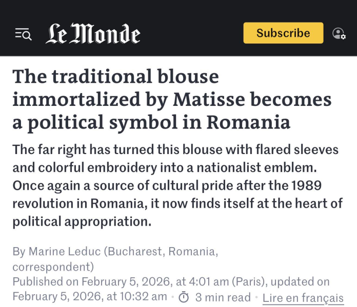 Un articol publicat în cotidian francez Le Monde în data de 5 februarie 2026 a stârnit valuri de indignare în România, după ce a susținut că ia tradițională românească, imortalizată în picturile lui Henri Matisse, a fost transformată „într-un simbol naționalist de extrema dreaptă”. Textul semnat de corespondenta Marine Leduc, intitulat „The traditional blouse immortalized by Matisse becomes a political symbol in Romania”, afirmă că portul popular românesc este „apropriat politic” de curente ideologice radicale.
