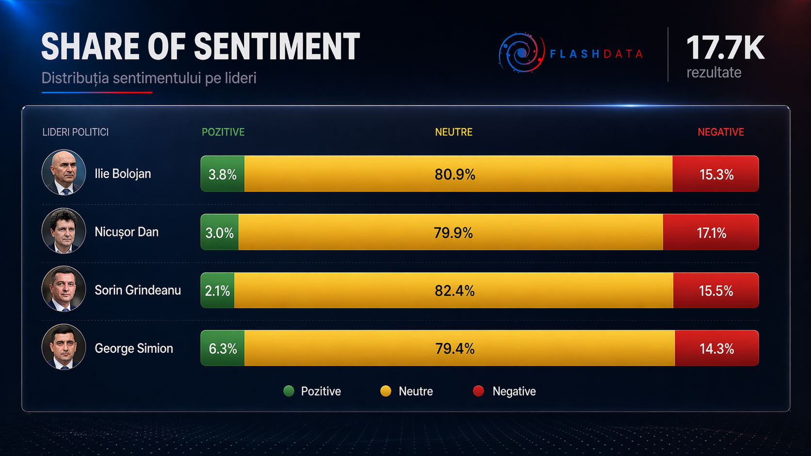Datele FlashData, pe un eșantion de 17,7 mii de rezultate, arată că sentimentul din mediul online este dominat clar de zona neutră în cazul tuturor celor patru lideri politici analizați: Ilie Bolojan, Nicușor Dan, Sorin Grindeanu și George Simion. Cu alte cuvinte, cea mai mare parte a conversației online este una de informare, mențiune sau relatare, nu una explicit favorabilă sau ostilă.